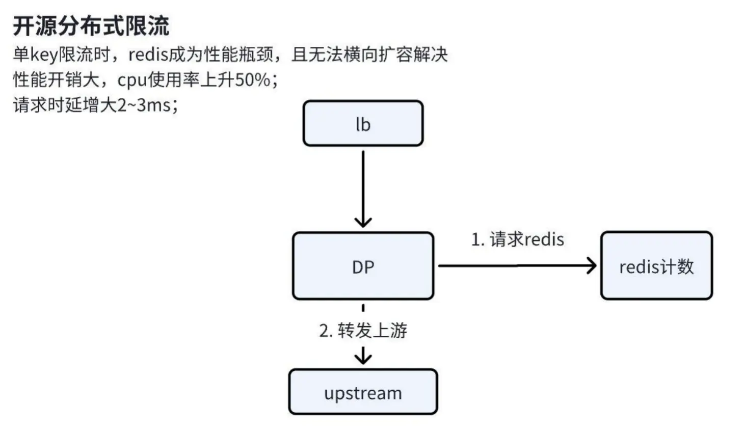 请求时延增加:开源分布式限流方案需先访问 Redis 完成计数,再将请求转发至上游,导致业务请求时延增加 2-3 毫秒。